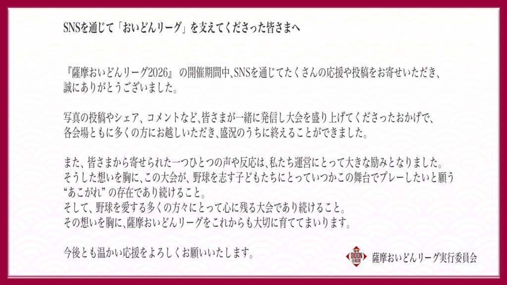 主催:薩摩おいどんリーグ実行委員会後援:鹿児島県・鹿児島市・薩摩川内市・姶良市・鹿屋市・枕崎市・出水市・指宿市・阿久根市