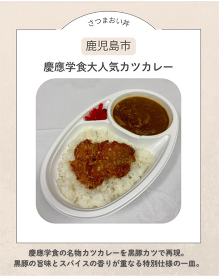 慶應大学の学食で高い人気を誇るカツカレーを鹿児島仕様に再現。鹿児島らしく黒豚カツを使用し、肉の旨味とコクが際立つ仕上がりに。スパイスの香りと食べ応えを存分に楽しめる満足感のあるカレー。
