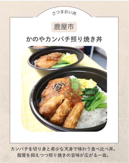 鹿屋名物のカンパチを切り身と希少な天身の2種類で味わえる照り焼き丼。一杯で食べ比べができ、それぞれの旨味と食感の違いを楽しめる。照り焼きのコクがご飯によく合い、贅沢さと食べやすさを両立した鹿屋らしい味わい。