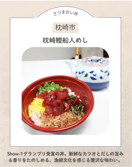 新鮮なカツオを使い、だしの旨味を存分に感じられる枕崎の名物丼。漁師が船上で味わってきた漁師めしをベースに、香りと味わいのバランスを大切に仕上げている。枕崎ならではの食文化を感じられる一品。