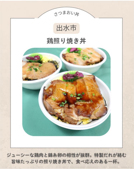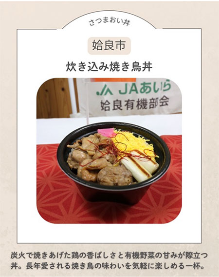 姶良市産の有機野菜と国産厳選鶏を炭火で焼き上げた香ばしい丼。30年以上続く焼き鳥の味を丼スタイルで表現し、素材の旨味をしっかり感じられる、ついつい食べ進めたくなる姶良のご当地メニュー。