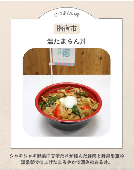 生野菜の上に甘辛だれで炒めた豚肉と野菜を重ね、仕上げに温泉卵を添えた丼。濃厚なタレと卵が混ざり合い、コクとまろやかさが広がる。食感や味の変化も楽しめる指宿らしいスタミナメニュー。
