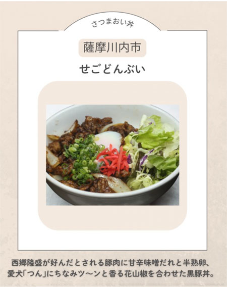西郷隆盛が好んだとされる豚肉を使い、甘辛い味噌だれを絡めた黒豚丼。味噌づくりが得意だったという逸話をもとに生まれた味つけで、半熟卵がコクを添える。愛犬「つん」にちなみ花山椒を加え、香りの変化も楽しめる。